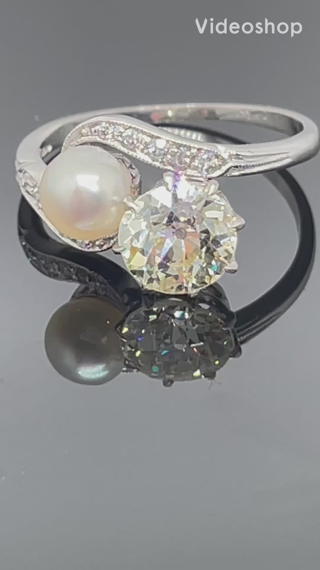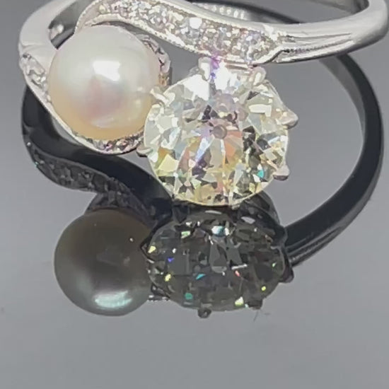 A DIAMOND AND PEARL TOIET MOI RING in platinum, set with an old European cut diamond of 1.17 carats and a pearl of 5.3mm, accented by rows of single cut diamonds, full British hallmarks, size K / 5.25, 3.2g.